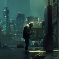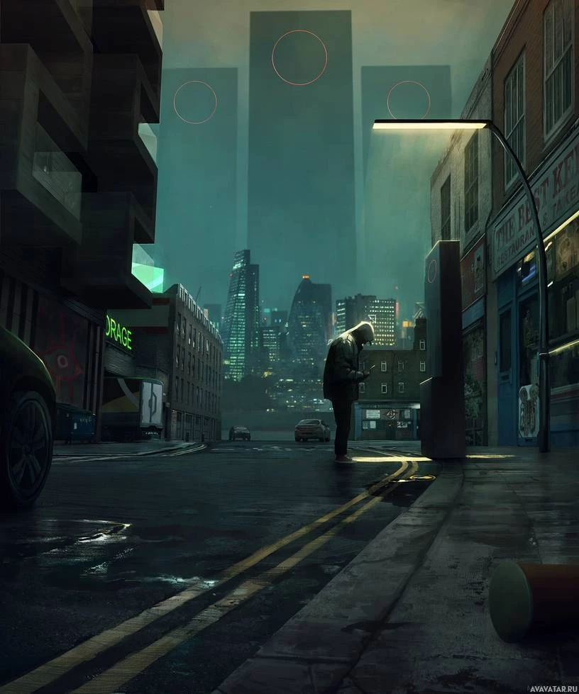 The image shows a dark, moody scene of an urban