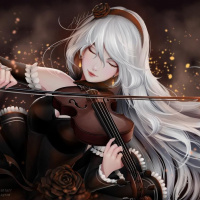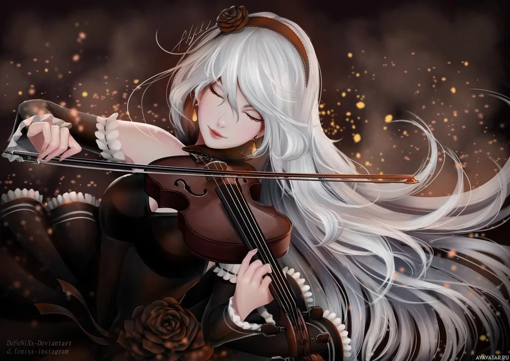 white hair and closed eyes. She is playing a violin, which suggests that she might be a musician or playing music. The setting appears to be in the evening or nighttime due to