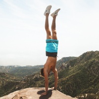 The image features a man performing a handstand on what appears to be a rocky outcrop with a beautiful landscape in the background. He is wearing shorts and sneakers, suggesting he might be engaged in some form of athletic or recreational activity.