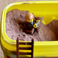 a yellow container filled with a brown substance that resembles sand or dirt. Inside this container, there are Lego figures arranged to create a scene. There's