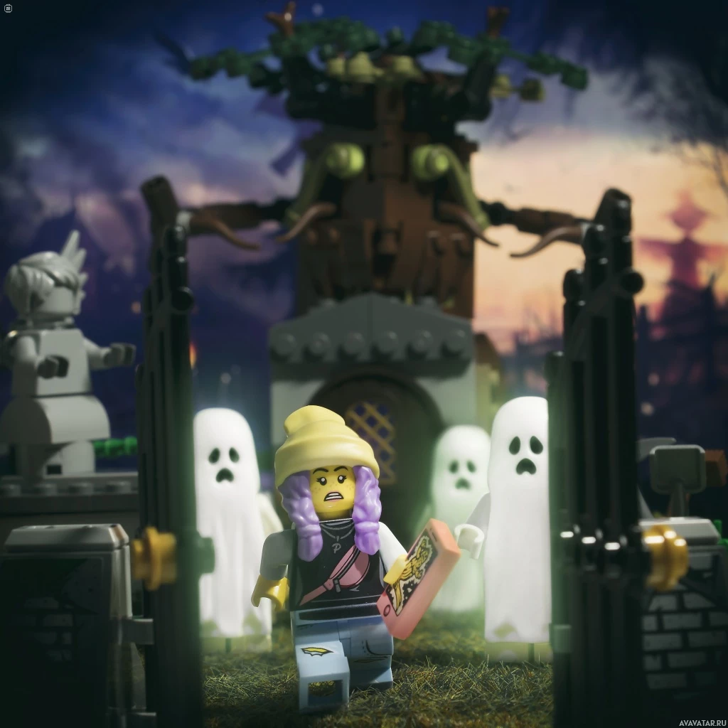 a Lego figure, which appears to be a minifig, standing in the foreground. Behind the minifig is a Halloween-themed scene with various elements like ghosts and pumpkins. There's also a cobweb-covered building structure that resembles a haunted house or castle, enhancing
