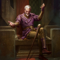 a chamber of secrets. He is wearing elaborate purple and gold robes with a sash across his chest, holding a staff, which suggests he might be