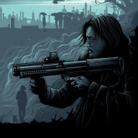 a video game or movie, holding a weapon. He is dressed in a rugged outfit suitable for an adventurous setting, possibly in a dark or