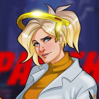 The image shows an illustrated character, Mercy, from the video game Overwatch. She is depicted with her iconic wings and a lab coat, standing in front of a backdrop that features what appears to be the logo for Overwatch.