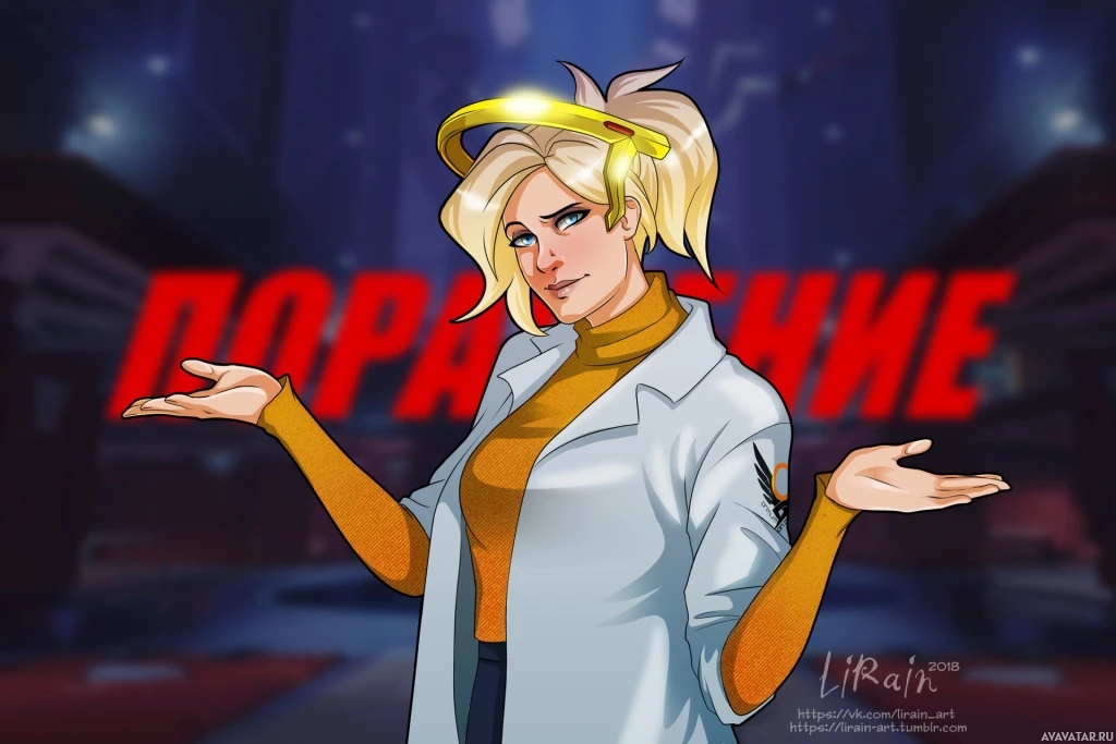 На картинке изображен персонаж по имени Мерси из видеоигры Overwatch. Она изображена со своими культовыми крыльями и в лабораторном халате, стоящей на фоне чего-то похожего на логотип Overwatch.