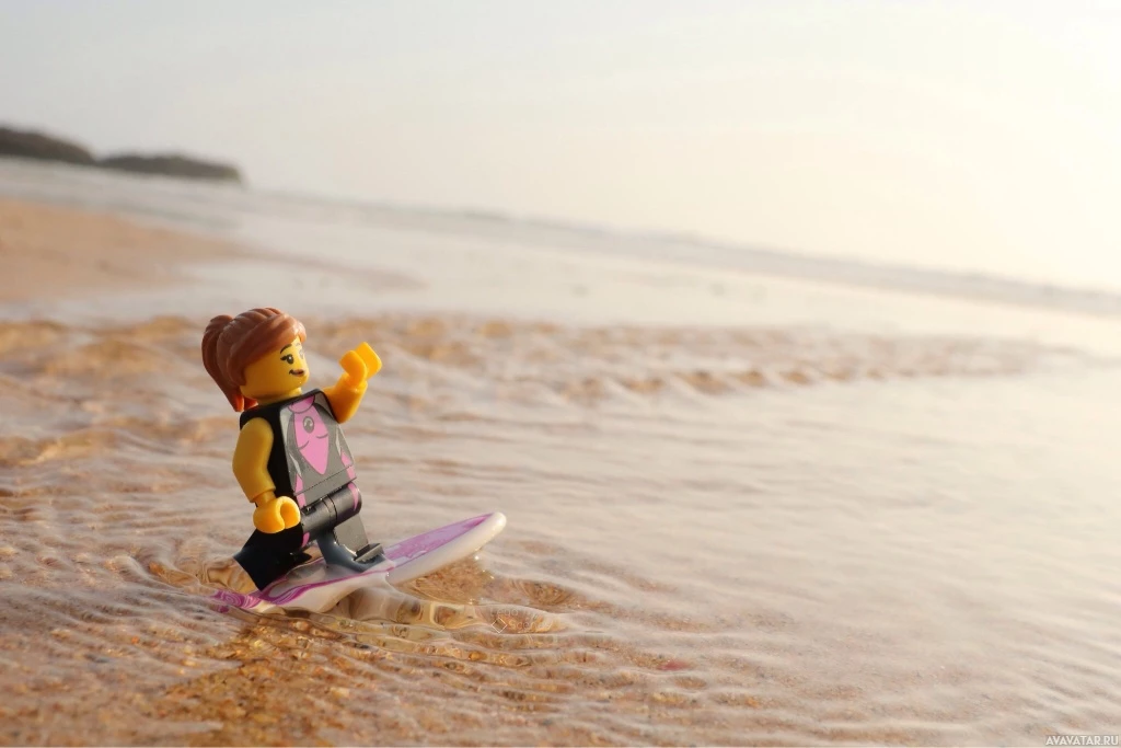 На картинке изображена фигурка девушки из конструктора Lego, занимающейся серфингом. Она стоит на доске для серфинга, установленной на краю того, что кажется береговой линией или кромкой воды на пляже. Солнце стоит низко над горизонтом, что позволяет предположить, что сейчас либо раннее утро, либо поздний вечер. Фигурка Lego изображена в активной и динамичной позе, передающей суть серфинга.