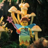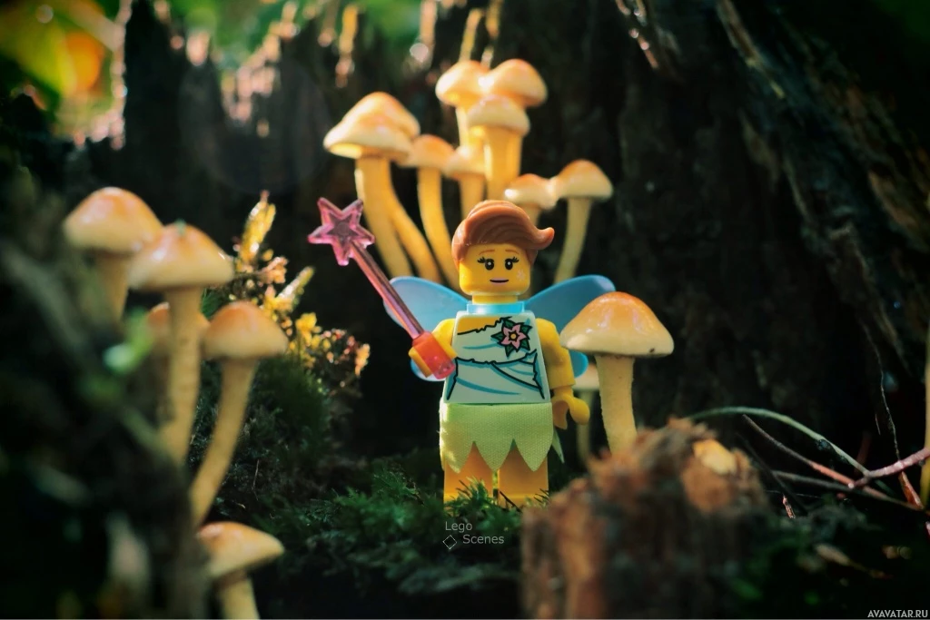 a Lego minifigure dressed as Tinker Bell, standing in front of a group of mushrooms. The background is lush and appears to be