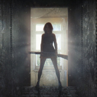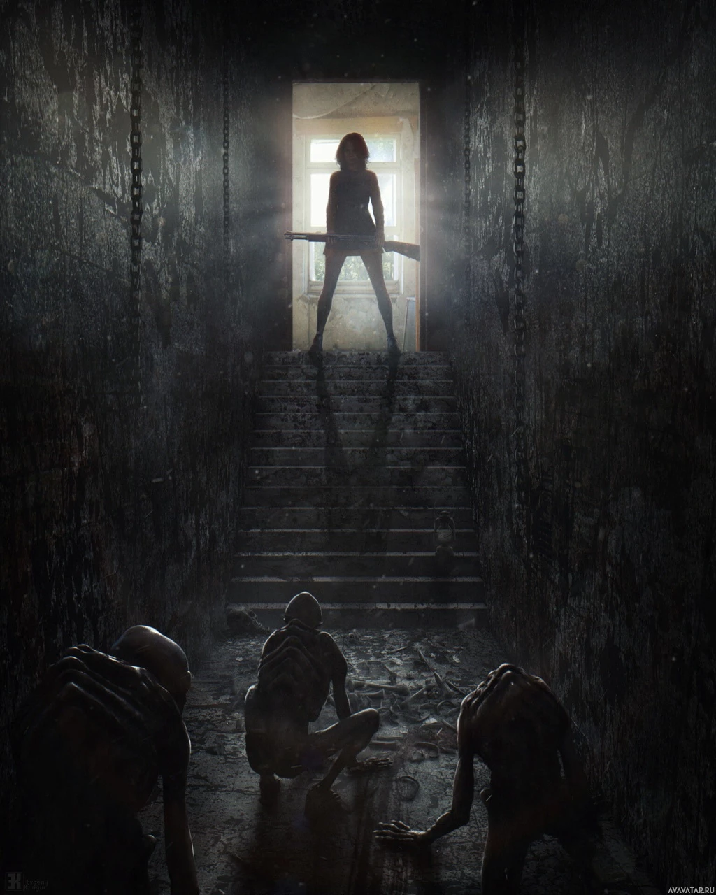 a female character standing in the doorway, holding what appears to be a weapon. In front of her are two figures that resemble zombies or