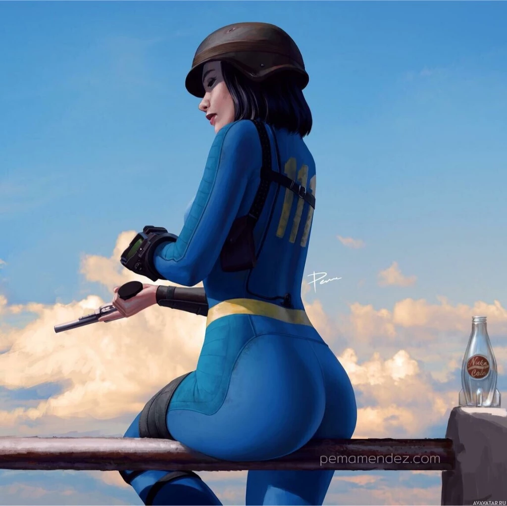 an animated character dressed in a diving suit with the number 1014, which is associated with the Fallout series of video games. The character is seated and appears to be looking out at a horizon or sky. There's also a bottle visible on the ground next to the character, suggesting a setting that might be related to