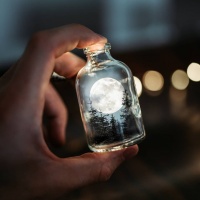 The picture shows a hand holding a glass bottle with a moonlit scene inside. It appears to be a creative piece, possibly used for decoration or as a display of photography techniques capturing the night sky and the full moon.