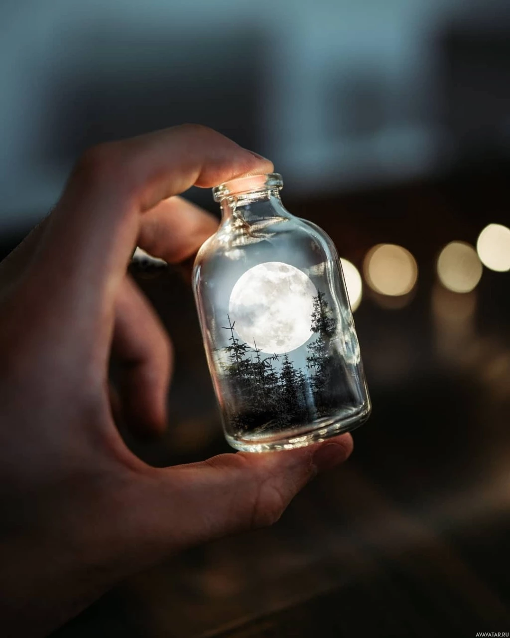 На картинке изображена рука, держащая стеклянную бутылку с изображением лунного пейзажа внутри. Это, по-видимому, творческая работа, возможно, используемая для украшения или демонстрации фотографических техник, позволяющих запечатлеть ночное небо и полную луну.