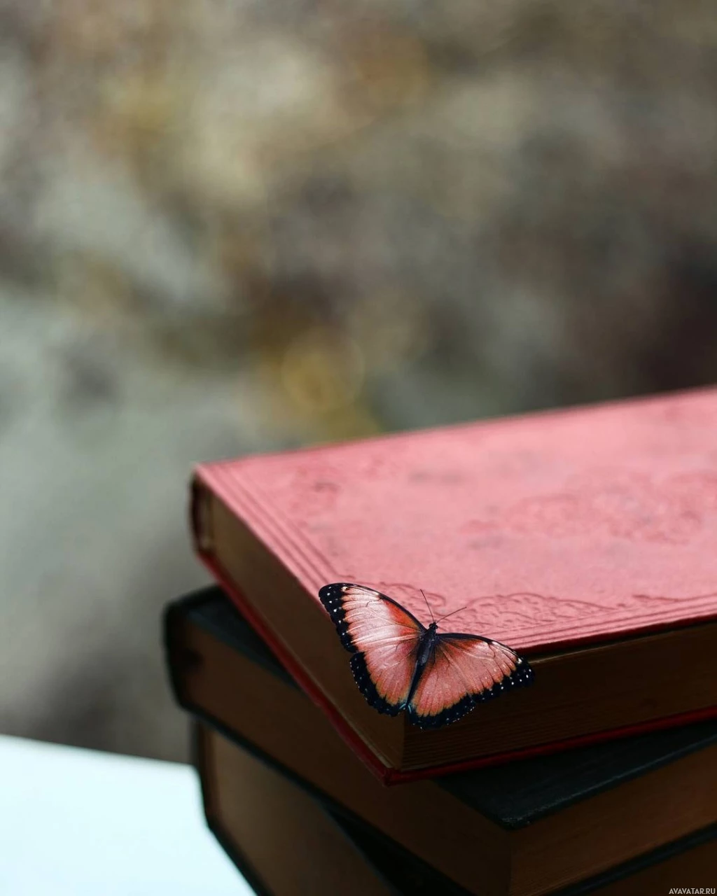 На картинке крупным планом изображена открытая книга обложкой вниз. На корешке книги изображена бабочка, садящаяся на нее. На заднем плане изображен пейзаж на открытом воздухе с природными элементами, которые плохо видны из-за того, что в центре внимания находятся бабочка и книга.