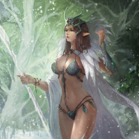 the fantasy world she inhabits. She's holding what appears to be a staff or wand in her right hand, which could imply she possesses