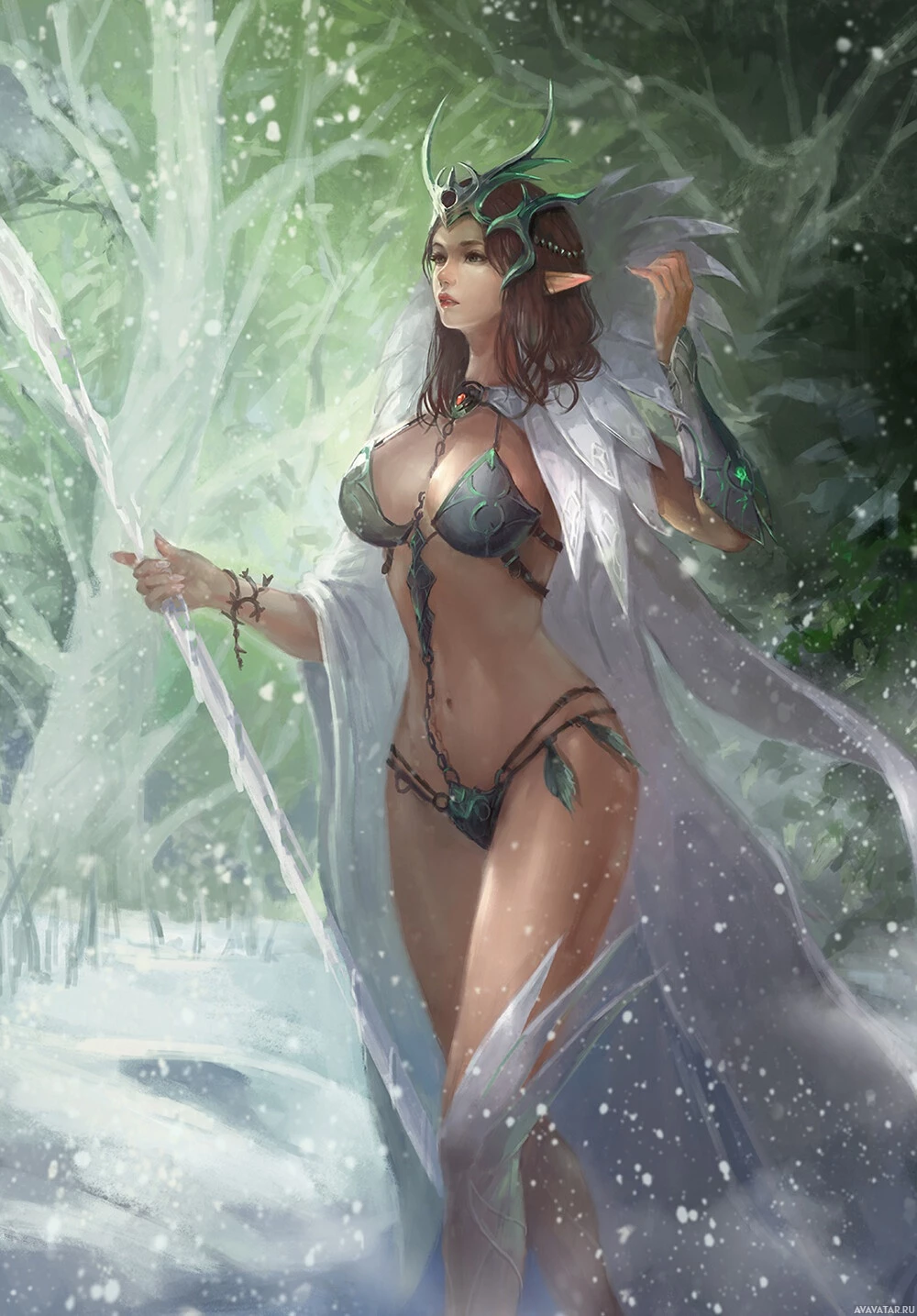 a forest with snow on the ground, suggesting it might be winter. The elf is wearing armor that has an intricate design, indicative of her status or role within