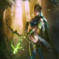 На картинке изображен персонаж-эльф, что является распространенным элементом в жанрах фэнтези. Она держит лук и, похоже, либо готовится к стрельбе, либо только что выпустила стрелу. Ее наряд включает доспехи и накидку, которые предполагают, что она может обладать магическими способностями или является частью мифической сюжетной линии. Обстановка напоминает лес, сквозь деревья которого проникает солнечный свет, создавая безмятежную и в то же время таинственную атмосферу.
