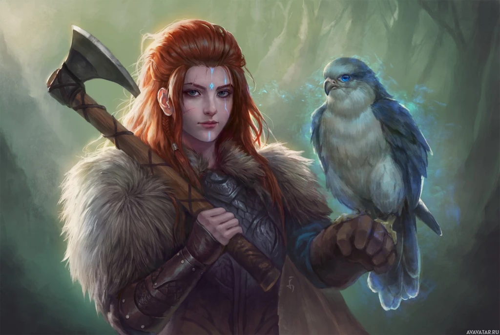 На картинке изображена рыжеволосая женщина, одетая во что-то похожее на доспехи и держащая в руках топор. На левой руке у нее сидит птица, которая по силуэту напоминает ворона. Этот персонаж изображен в фантастической обстановке с элементами леса на заднем плане, напоминая о стиле высокого фэнтезийного искусства.