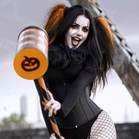 high boots, and a corset that give it a distinctive look. The setting suggests a Halloween theme, given the costume and props. Harley Quinn is often associated with Halloween due to her character's colorful and festive nature.