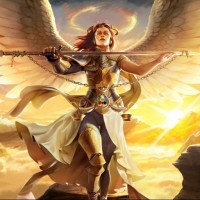 The image shows a fantasy-themed character who appears to be an angel. She is depicted with wings and is holding a sword, which suggests she could represent