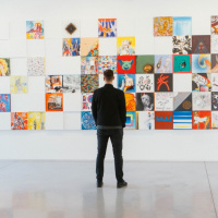 На картинке изображена художественная галерея, на переднем плане которой стоит человек. На заднем плане на стенах развешаны несколько произведений искусства в рамках. Работы различаются по стилю и цвету. Общая атмосфера предполагает спокойную и созерцательную обстановку, типичную для художественной выставки.