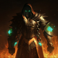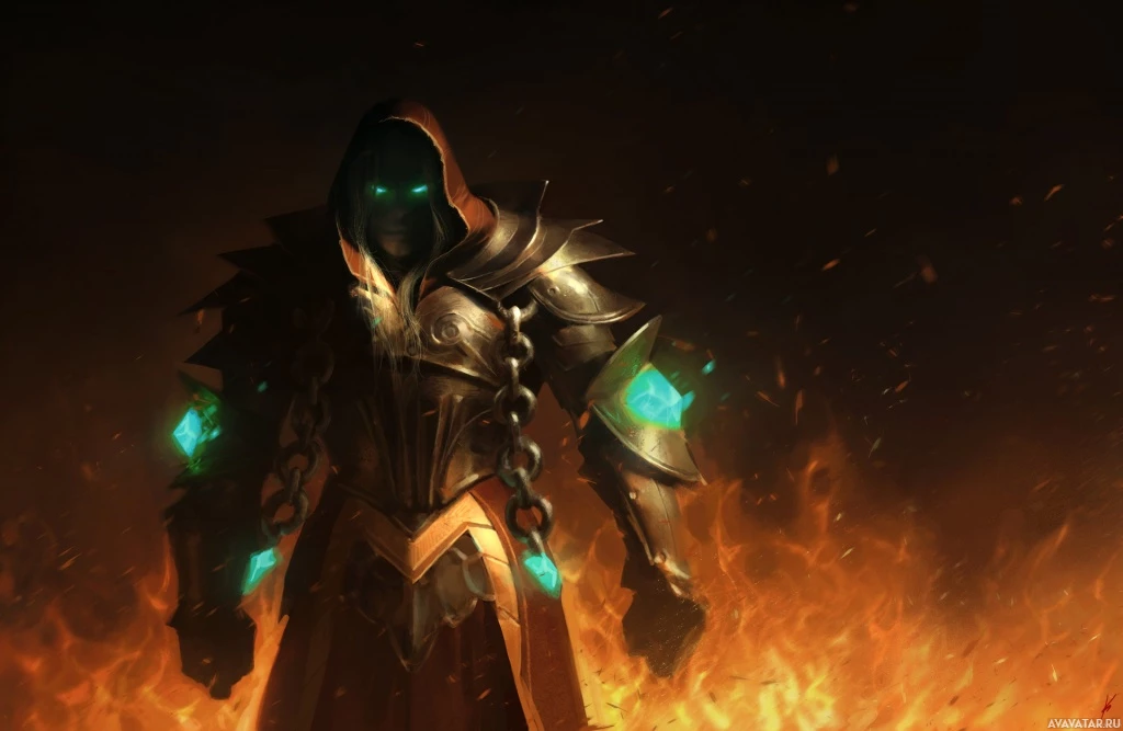 The image depicts a fantasy-themed character, who appears to be a warrior. The individual is wearing a hood and armor that resembles traditional medieval or fantasy attire. In the background, there are flames, indicating