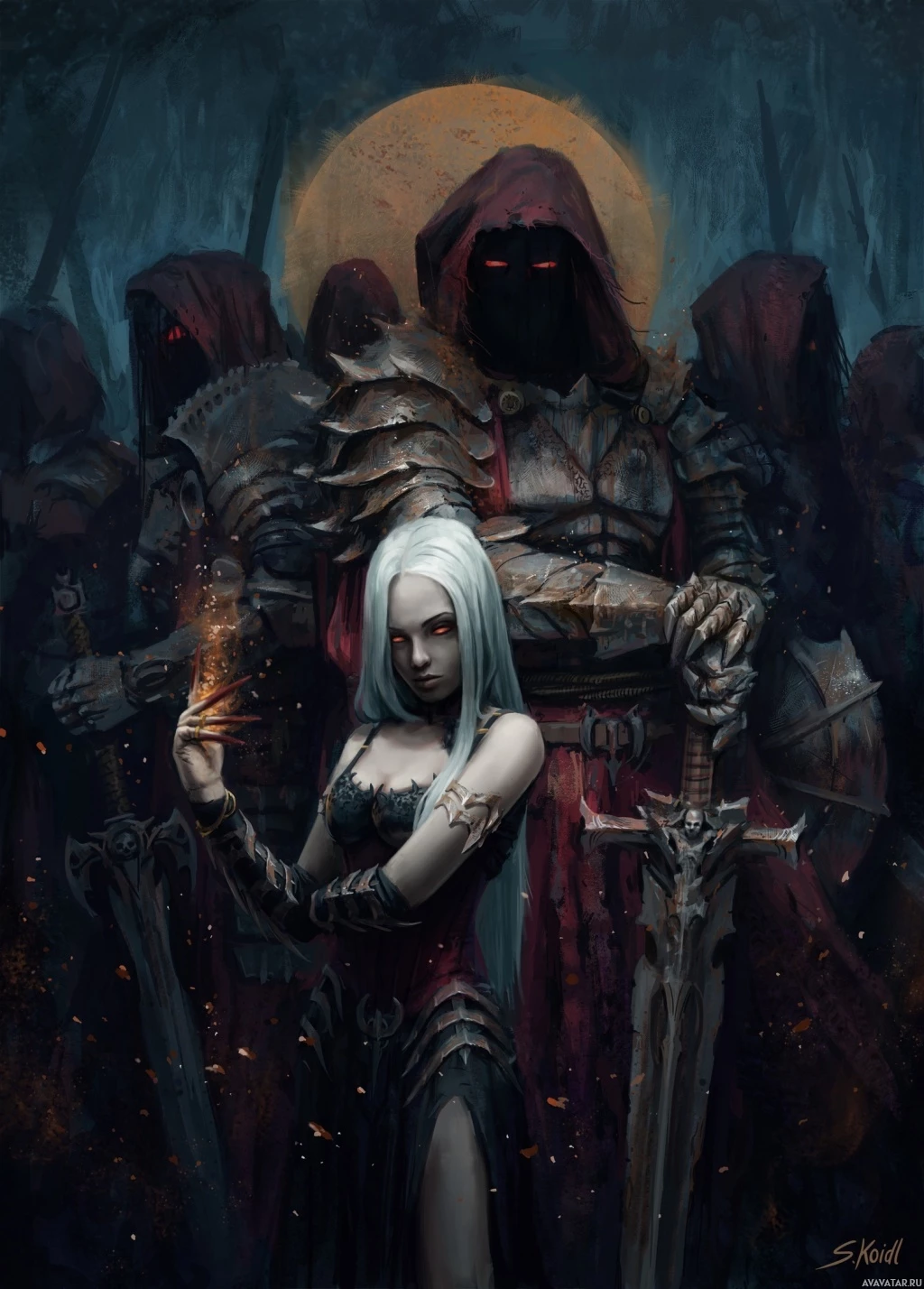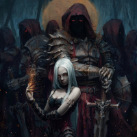 group of figures wearing hoods and robes, possibly representing a secretive or ominous presence in the scene. 4. The background suggests a dark, eerie atmosphere with a full moon illuminating the scene. The artwork is rich in detail, suggesting a narrative that might involve themes of magic, mystery, or perhaps an encounter between different factions or characters within this fantastical setting.