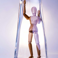 Wooden Man," standing inside what appears to be a glass or clear acrylic container. The figure is posed with one hand raised and the other at its side, giving an impression of