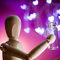 The image shows a wooden mannequin, which appears to be holding a small glass bottle with a label that reads "LOVE." In the background, there are heart-shaped lights that suggest a theme related to love or Valentine's Day.