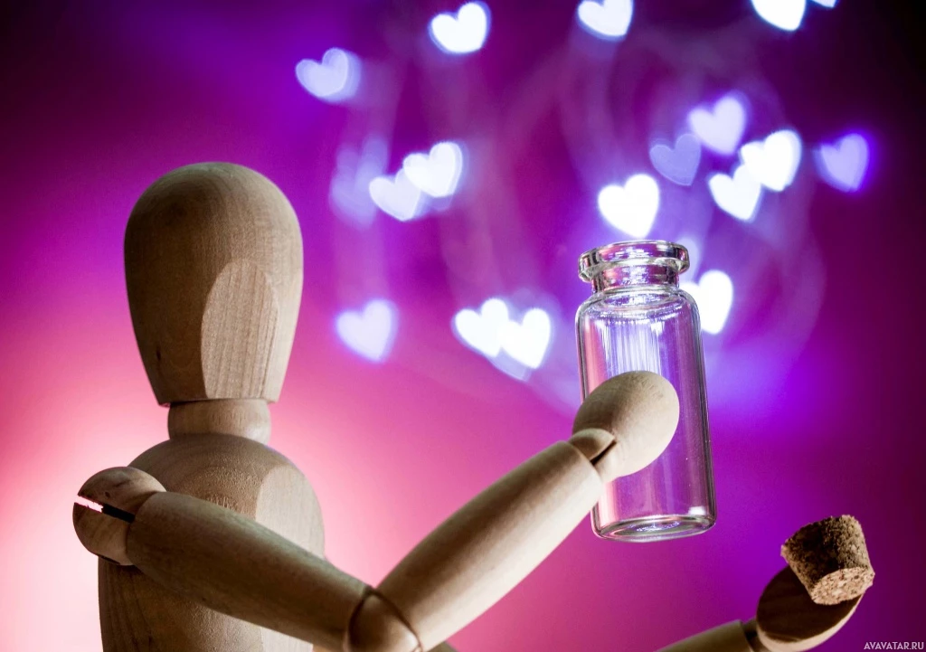 На картинке изображен деревянный манекен, который, похоже, держит в руках маленькую стеклянную бутылочку с надписью "LOVE". На заднем плане расположены светильники в форме сердечек, которые напоминают о любви или Дне Святого Валентина.