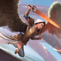 an angel with wings, holding a sword. She's depicted in mid-flight against a backdrop that suggests she's soaring through a sky or another dimension, indicated by the ethereal clouds and