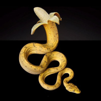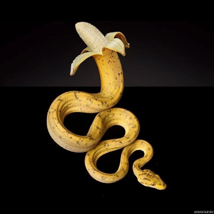 На картинке изображен желтый банан с коричневыми пятнами на кожуре, расположенный горизонтально в центре. Перед бананом изображена змея, свернувшаяся вертикально, как будто она ест банан или держит его в руках.