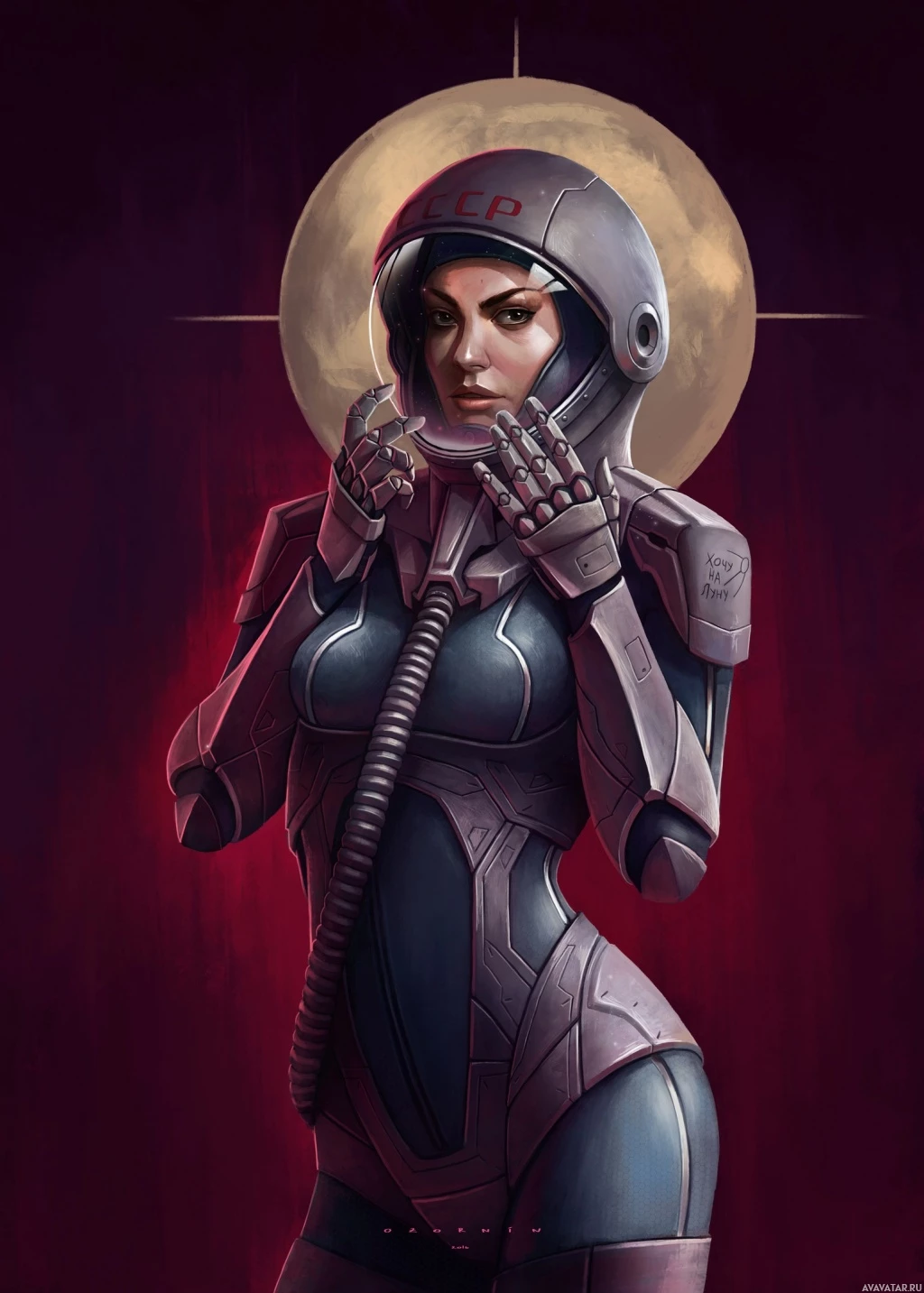 a female astronaut wearing a full suit and helmet with a visor. She is depicted against