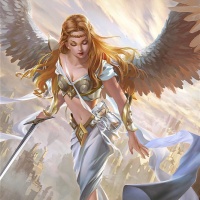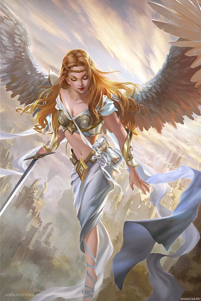 an angelic figure. The character has wings, which suggests she is an angel, and is equipped with a sword. She is wearing armor that appears to be a blend of fantasy elements. The background features dramatic