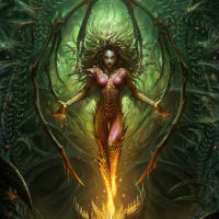 The image depicts an artistic representation of a character that appears to be Kerrigan from the "StarCraft" series. She is portrayed in a powerful and mystical pose, surrounded by dark,