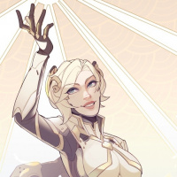 This is an illustration of Mercy, a character from the video game "Overwatch." She is depicted with blonde hair and blue eyes, wearing her signature armored suit. The artwork style suggests it could be fan-made or inspired by the game's graphics.