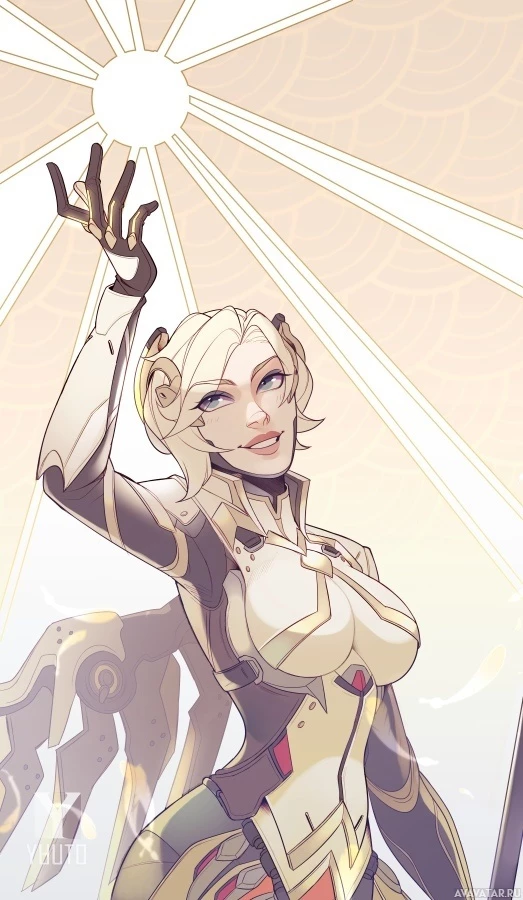 Это иллюстрация Мерси, персонажа из видеоигры "Overwatch". Она изображена со светлыми волосами и голубыми глазами, одетая в свой фирменный бронированный костюм. Стиль оформления позволяет предположить, что она могла быть создана фанатами или вдохновлена графикой игры.