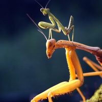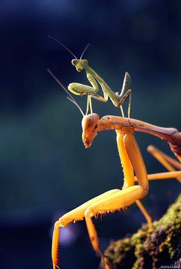 The picture shows a praying mantis perched on a tree branch. It appears to be capturing an insect for prey, which is