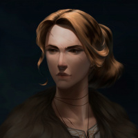 На этом снимке изображена женщина с рыжими волосами и серьезным выражением лица. Она одета в костюм, напоминающий средневековый или в стиле фэнтези, в том числе капюшон плаща отделан мехом, а на шее - замысловатое ожерелье. Судя по художественному оформлению, это может быть персонаж видеоигры или мультсериала.