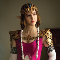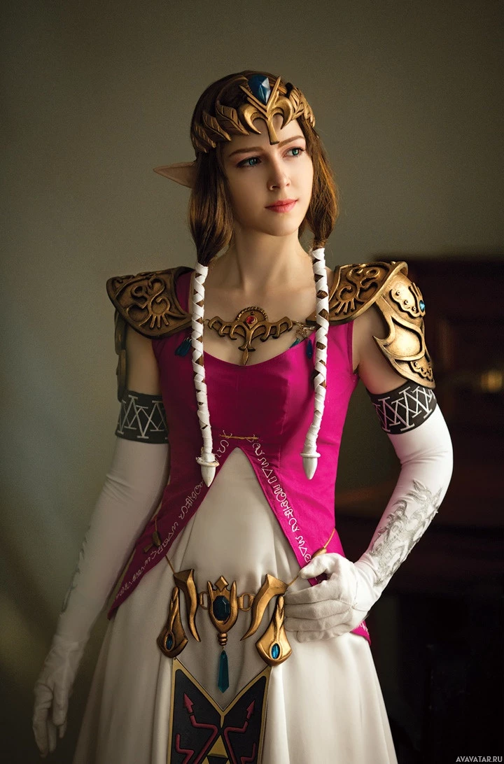the video game series "The Legend of Zelda". They are wearing a costume that resembles her outfit from the games. This includes a white and pink dress with
