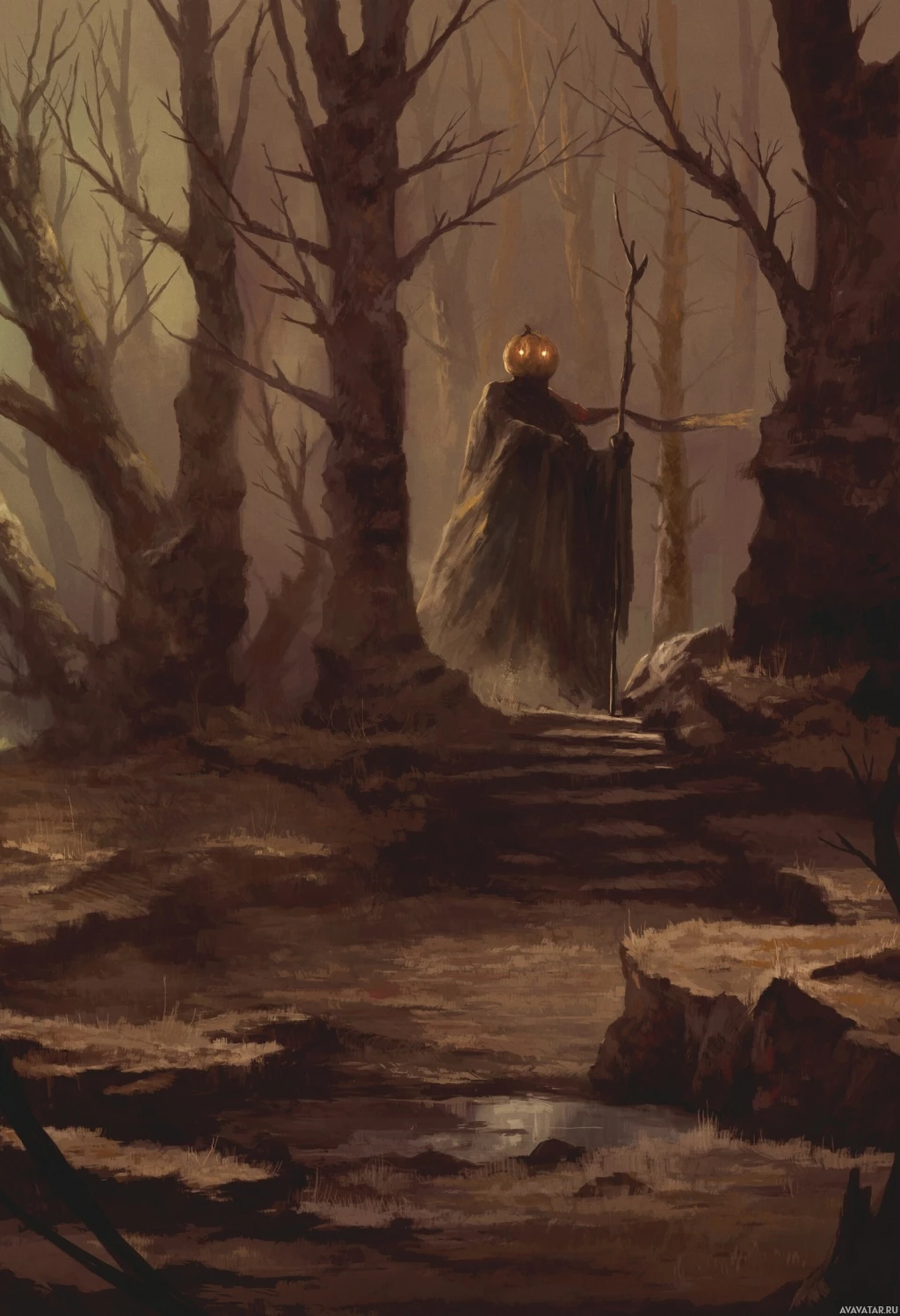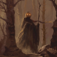 a sense of mystery and eeriness conveyed through the setting and the figure's attire, which suggests that it could be an illustration related to Halloween or a fantasy/horror theme.