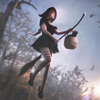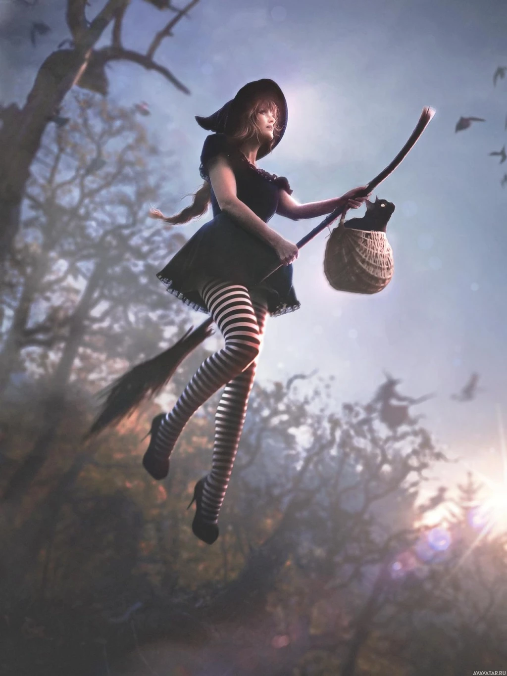 a black dress with striped stockings and a hat, holding a broomstick in her right hand. She appears to be flying through the air over a forest or woodland area with foggy or misty conditions. There is a basket attached to the broomstick, which is often associated with witches and fantasy themes. The girl is smiling and seems to be enjoying the moment of her flight.