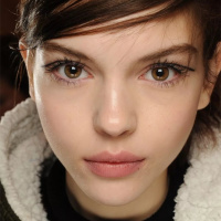 short hair and makeup, including eyeliner that accentuates their eyes. The individual appears to be wearing a garment with a fur trim around the collar, suggesting it might be a winter or