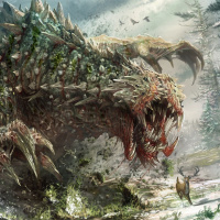 a fantasy scene featuring a monster. This creature appears to be a hybrid between a dragon and