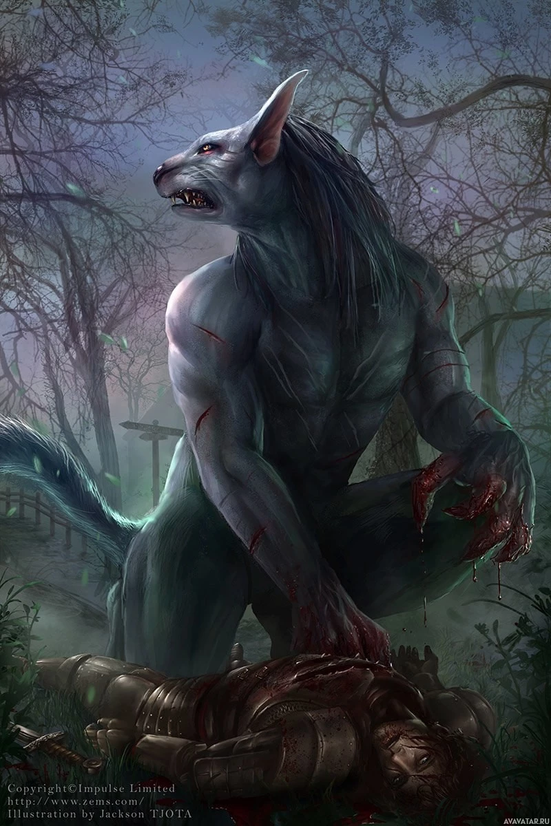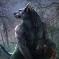 The image features a fantasy-themed depiction of a werewolf. The creature is anthropomorphic, with human-like arms and a torso, but its lower body resembles that of a wolf. It has