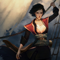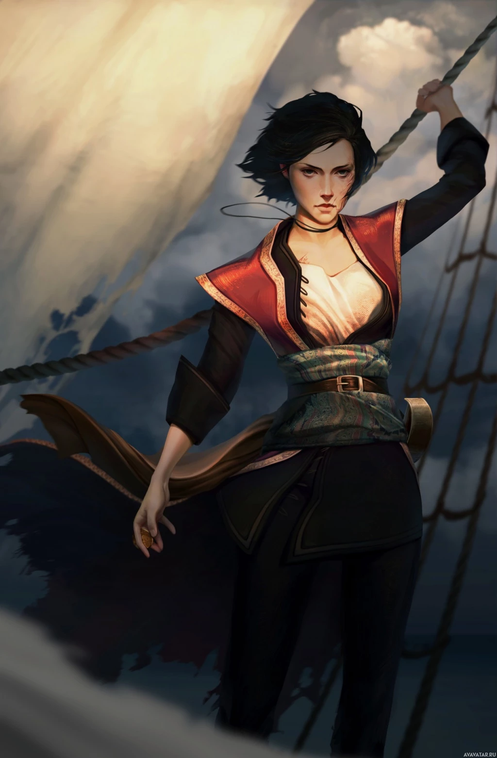 the edge of a ship with her hand gripping a railing and a bow in her other hand, suggesting she may be a warrior or archer. She has short