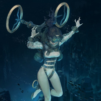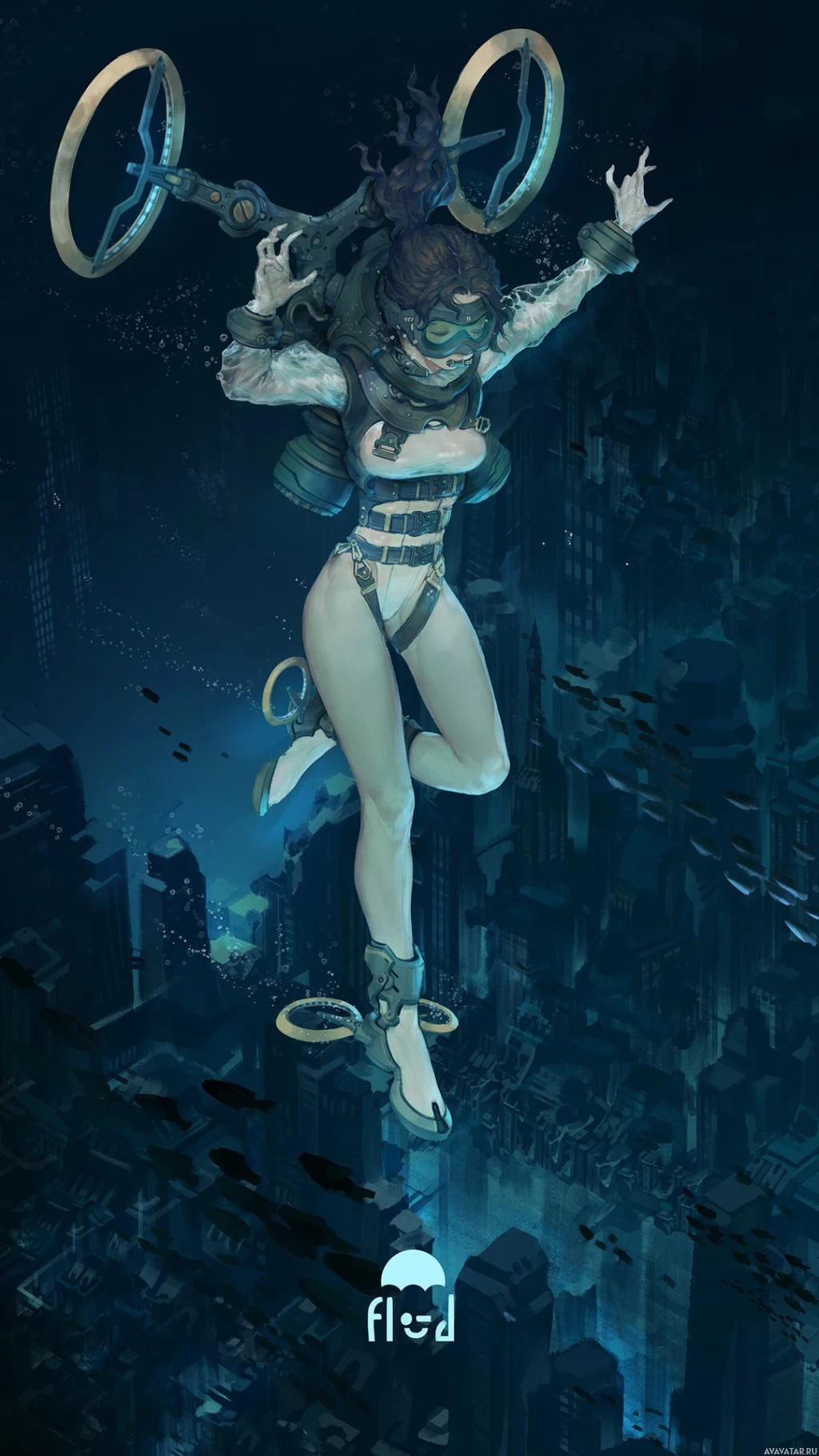 deep diving or the effects of underwater pressure. The background suggests an underwater setting with ruins, which could indicate a dystopian or
