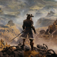 In the image, we see a person standing in front of a vast and dramatic landscape. The individual is wearing what appears to be historical or medieval attire, including a hat that could suggest