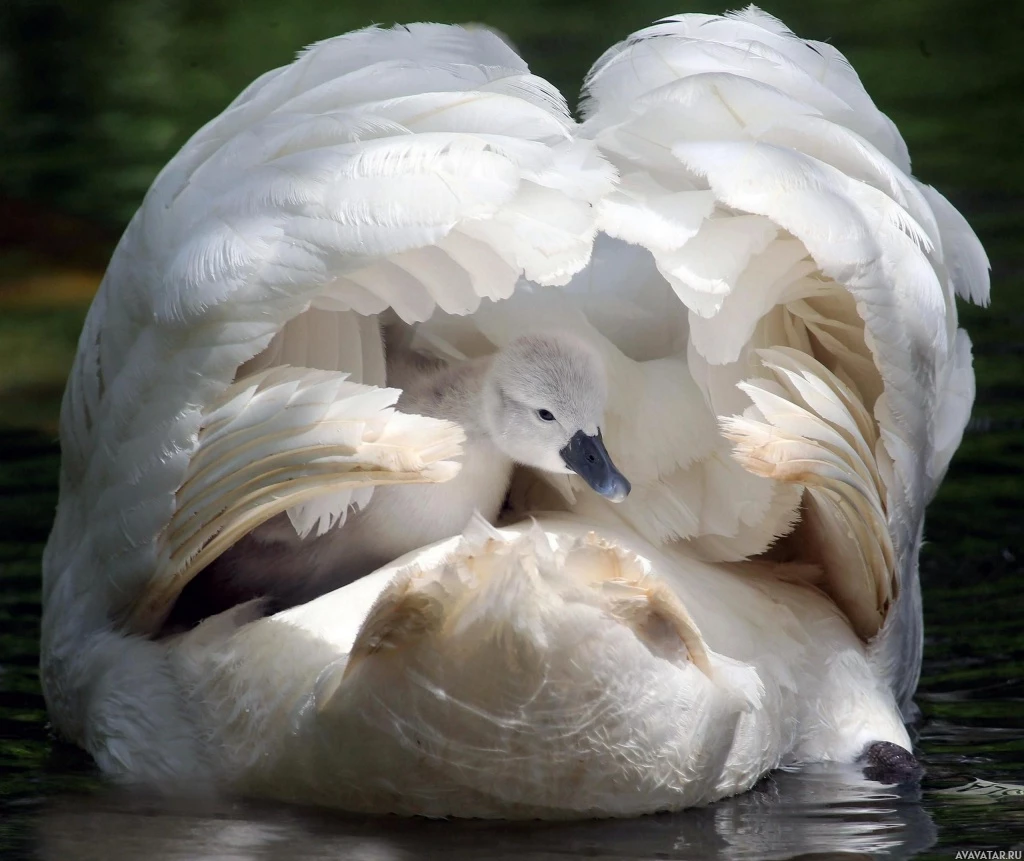 the adult swan's wings, which are spread wide to provide cover and protection for the babies. This is a typical behavior of swans to protect their offspring from