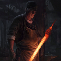 a red handle, standing in front of what looks like machinery or metalworking equipment. There is a grim or serious expression on his face, and he seems to be looking off to the side with intensity. The setting has an old-