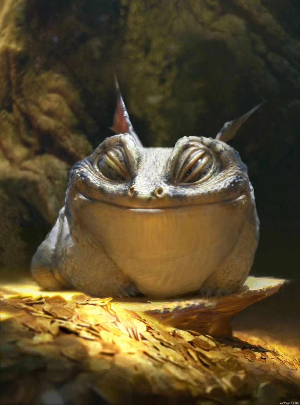 an open mouth, giving it a somewhat surprised or curious expression. The overall image has a fantasy theme due to