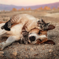 На картинке изображены собака и кошка, лежащие рядом. Кажется, что собака положила голову на спину кошки, что наводит на мысль о дружеских отношениях или привязанности между ними. Они находятся на открытом воздухе, а на заднем плане изображен пейзаж, похожий на пустыню.